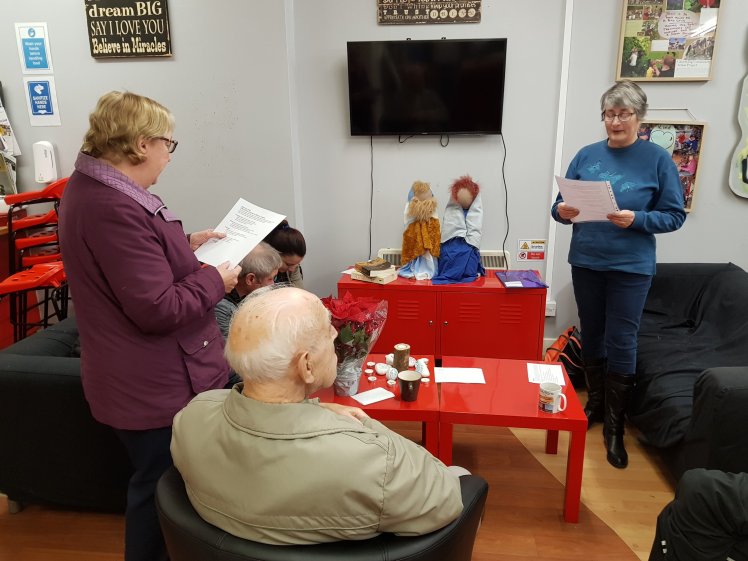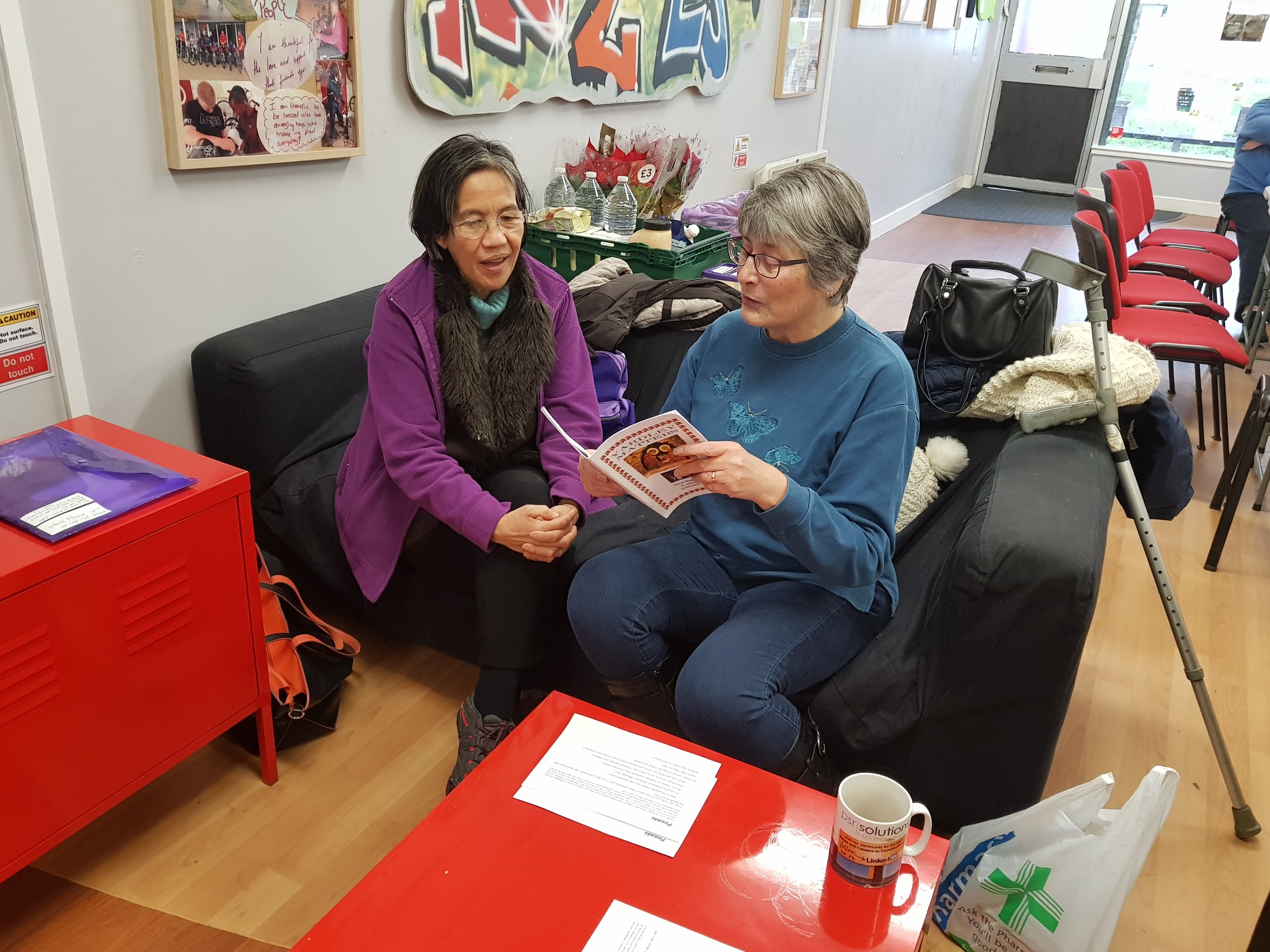 Rose sharing with Adel a story she had found about Christmas which she later shared with everyone at community lunch