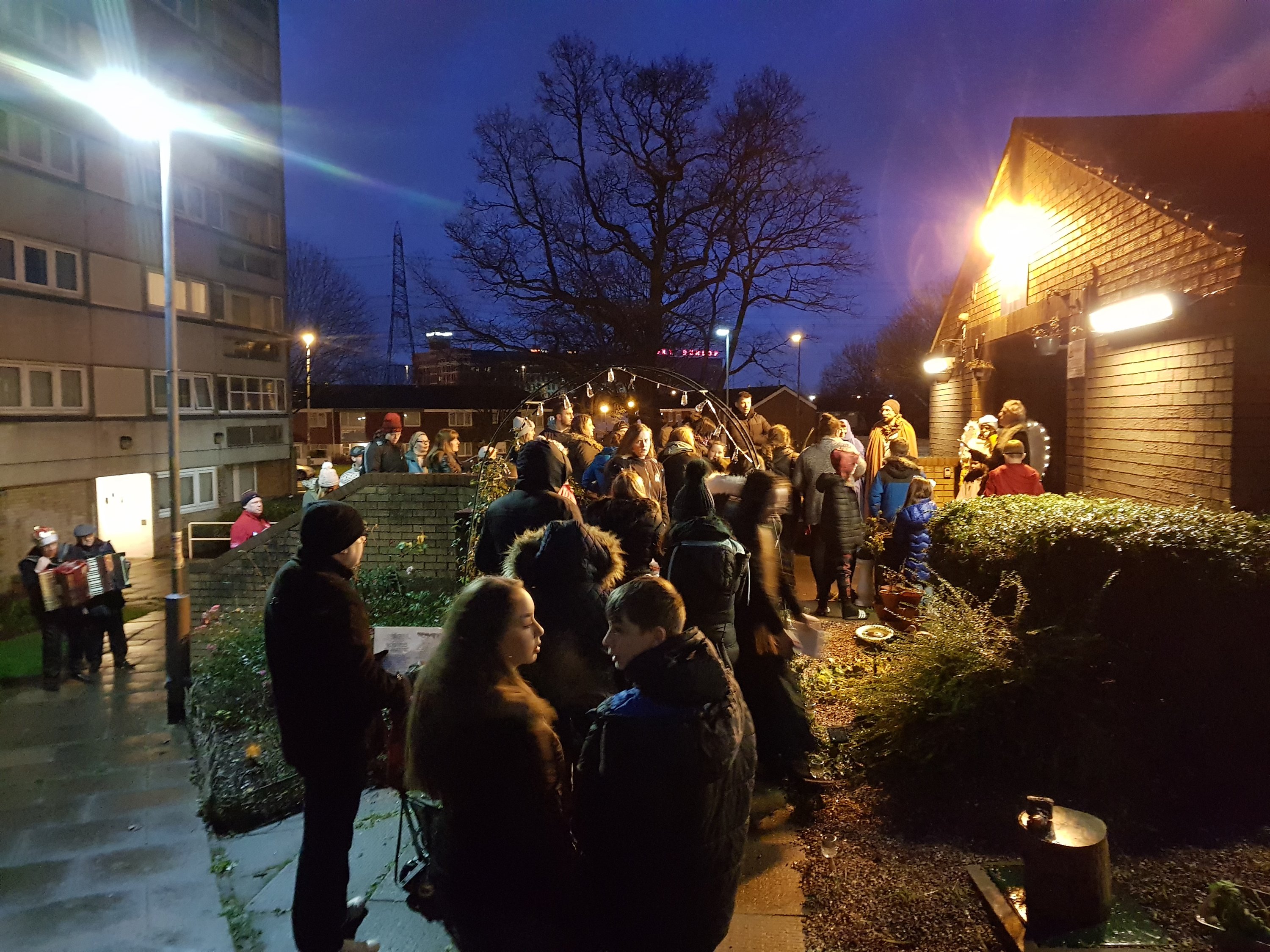 Gathering outside Ambridge House to welcome the Maggi. Part of the wonderful Street Nativity.