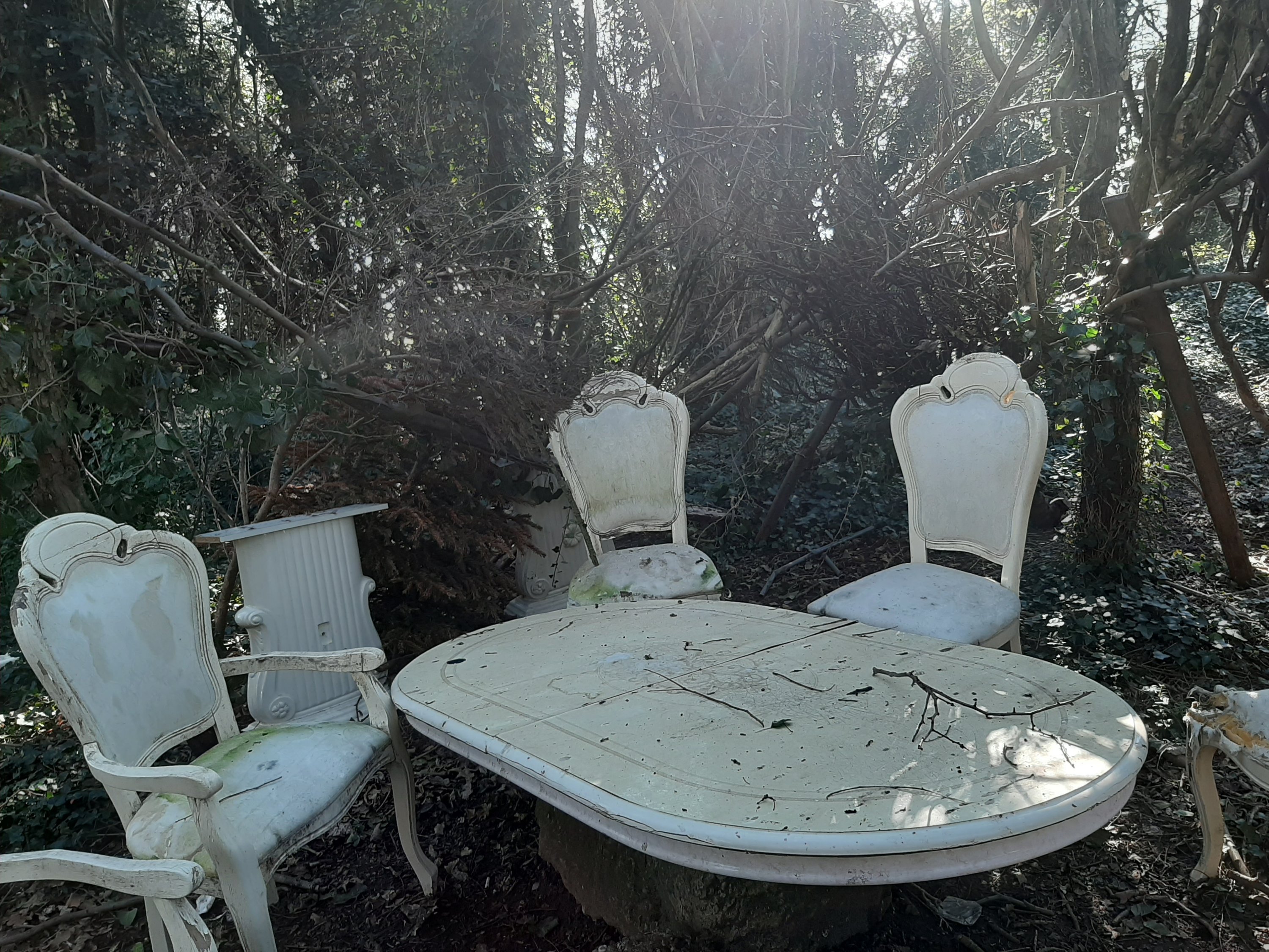 It started on a Sunday afternoon whilst taking a family stroll up into the woods. We stumbled across a table and chairs that had been placed in a clearing in the woods. This wasn’t outdoor patio furniture, but a full dining table, 6 chairs, and decorative pillars.